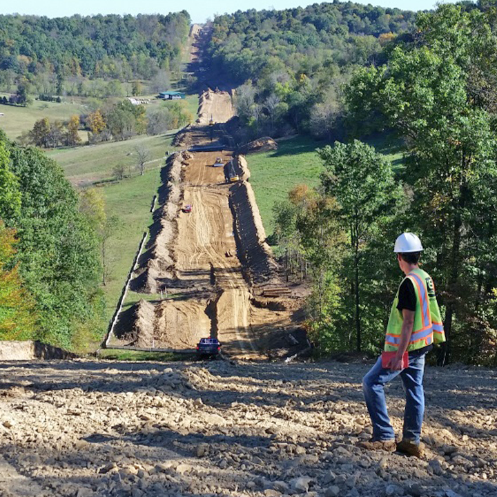 A construction site stretches through a hilly, rural landscape, where heavy machinery is grading a long, cleared path surrounded by trees. In the foreground, an EnviroScience environmental inspector wearing a hard hat and safety vest observes the site, ensuring environmental compliance and best management practices are followed.